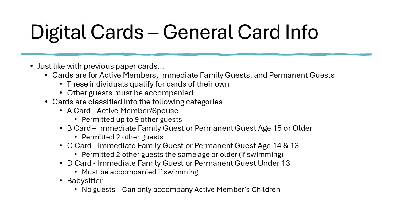 • The Active Members (Property Owners), Immediate Family and Permanent Guests. Please see the Guest Policy as defined in the Rules & Regulations. Those eligible remains unchanged from physical cards. Babysitters must be 15 or older and may ONLY bring the Active Member’s children. See FAQ #7 for “Other Guests”.