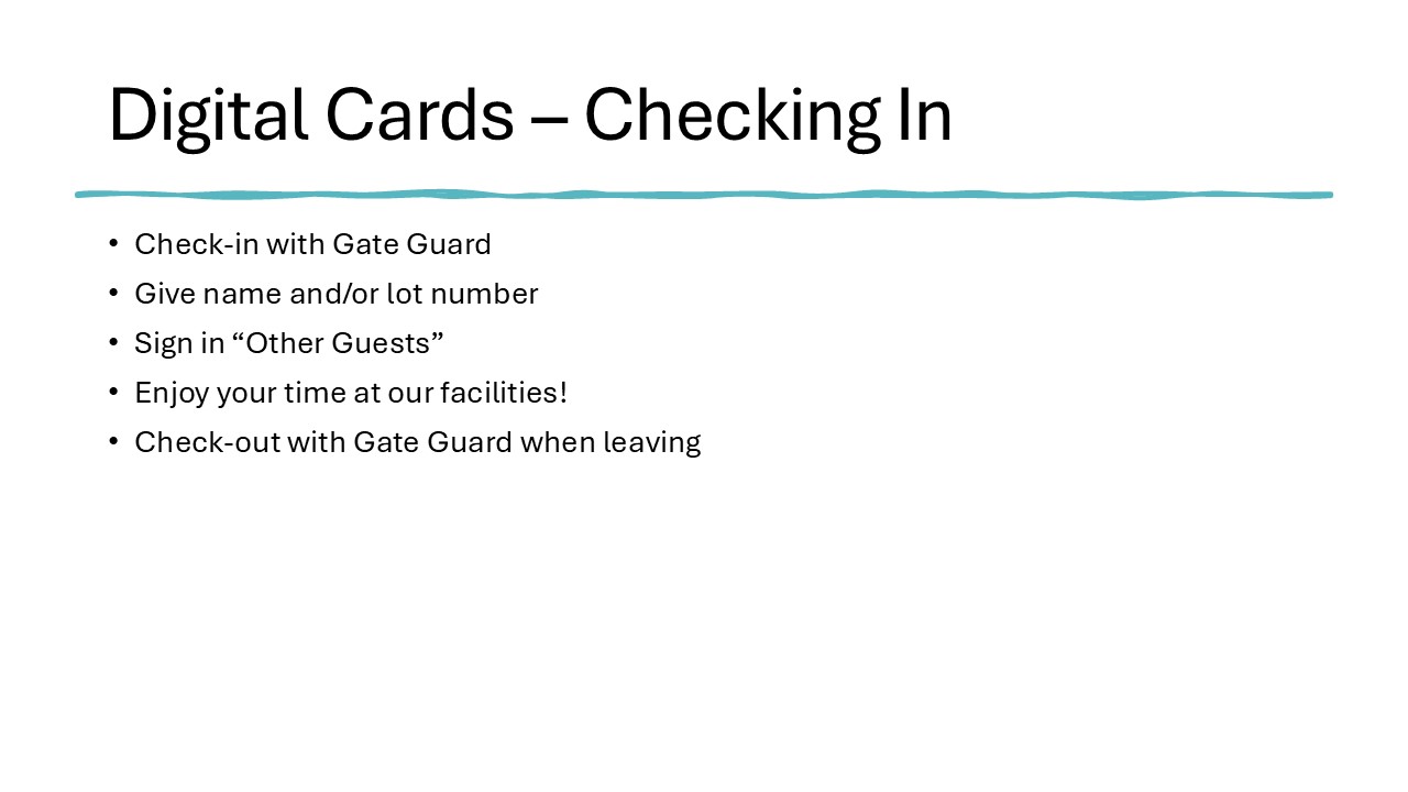 Once your account is created and card holders are approved, you will no longer need to carry a physical card or your phone to check-in at our facilities! Simply provide your information to the gate guard to check-in. Your guests will need to sign in.