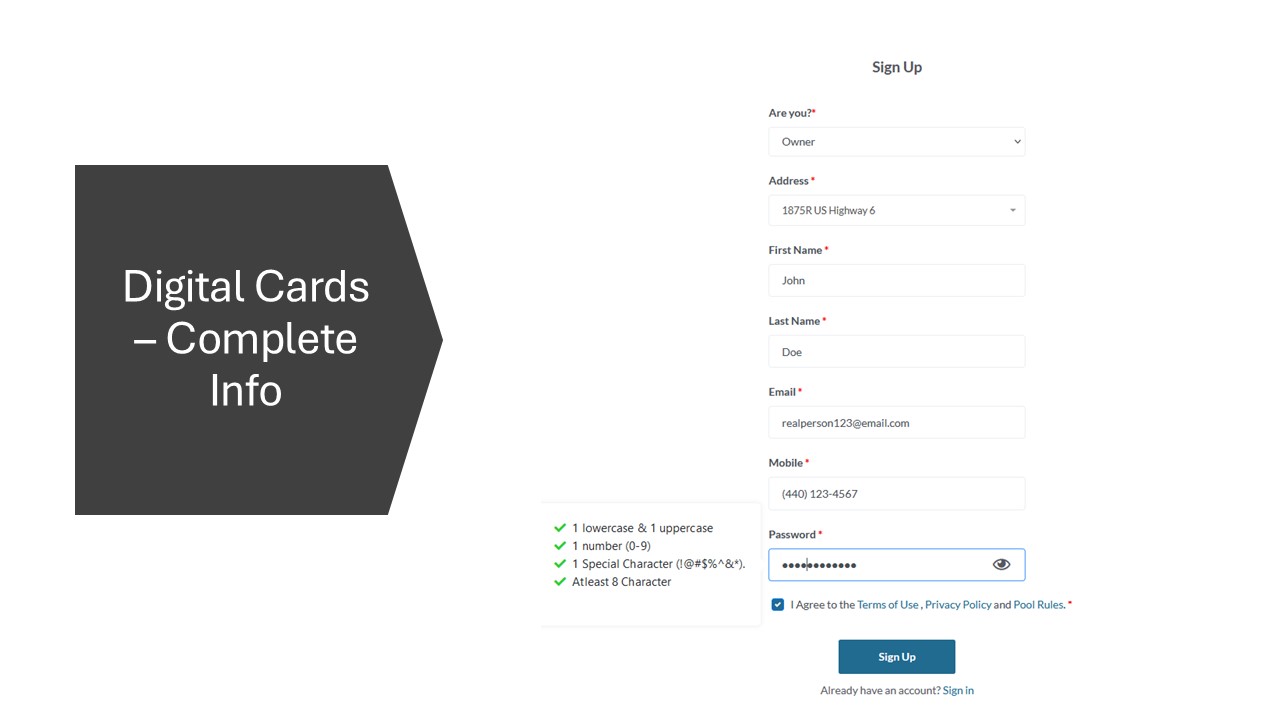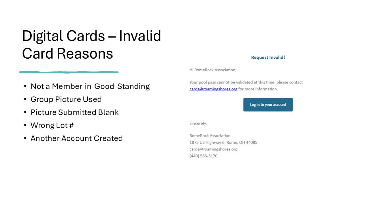 • Not comfortable registering on your phone or online? No problem. You can still register in person by visiting the RRA office at: 1875 US Highway 6, Rome, OH 44085. When visiting your HOA office, please make sure you bring your required documentation as outlined below as well pictures for the family members you wish to add.