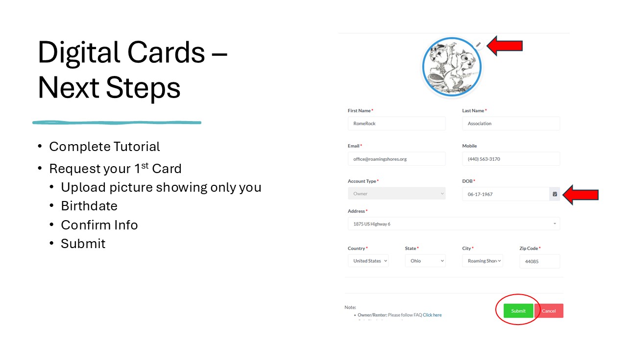 • If you have trouble uploading pictures, email cards@roamingshores.org or stop by the office.